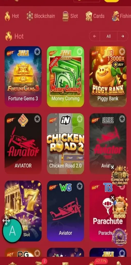 The platform offers slot games, card games, and lucky spin games. It regularly adds new games to keep players engaged.